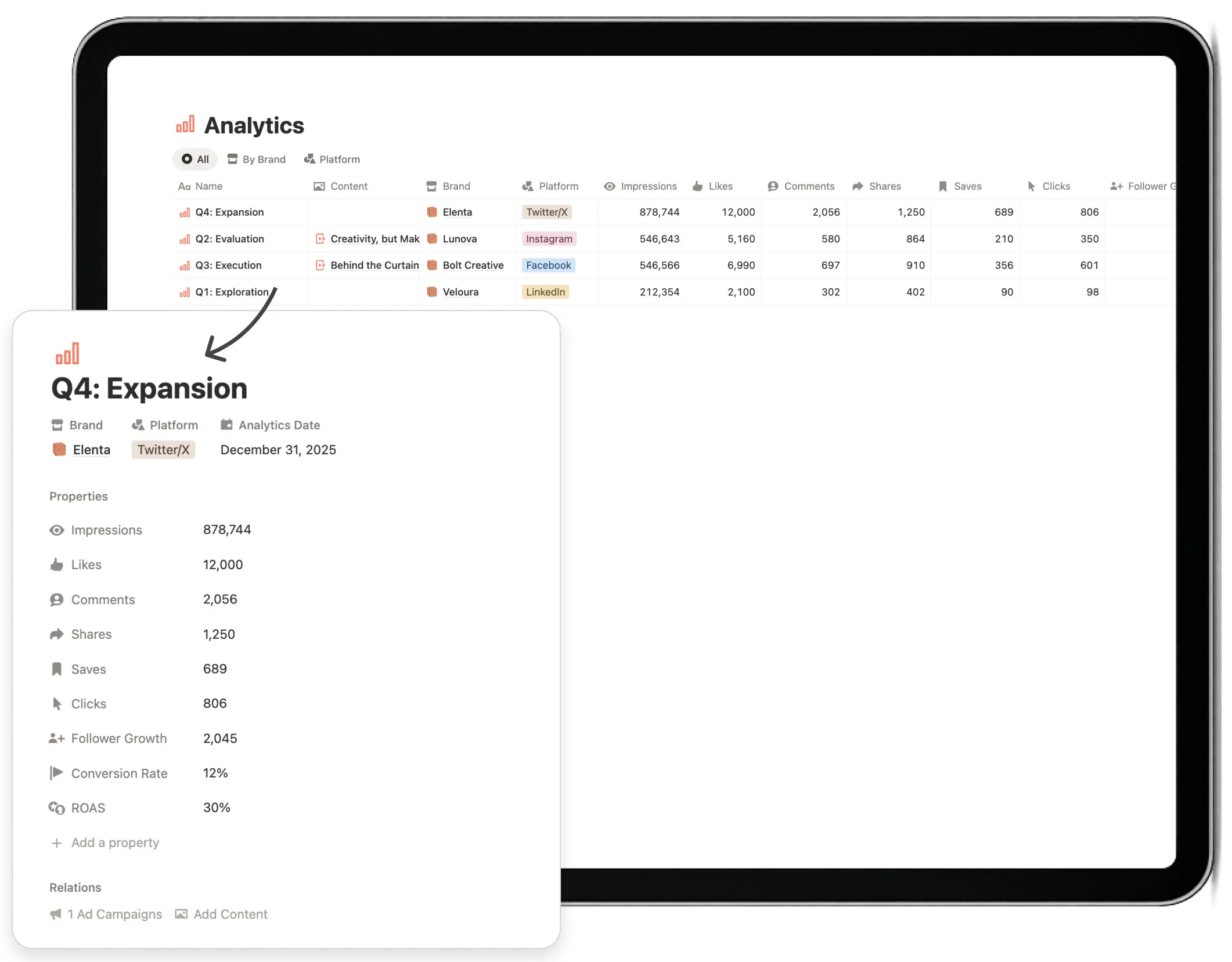 Centralized performance tracking across content, campaigns, platforms, and brands — designed for quick reviews, not reporting marathons.