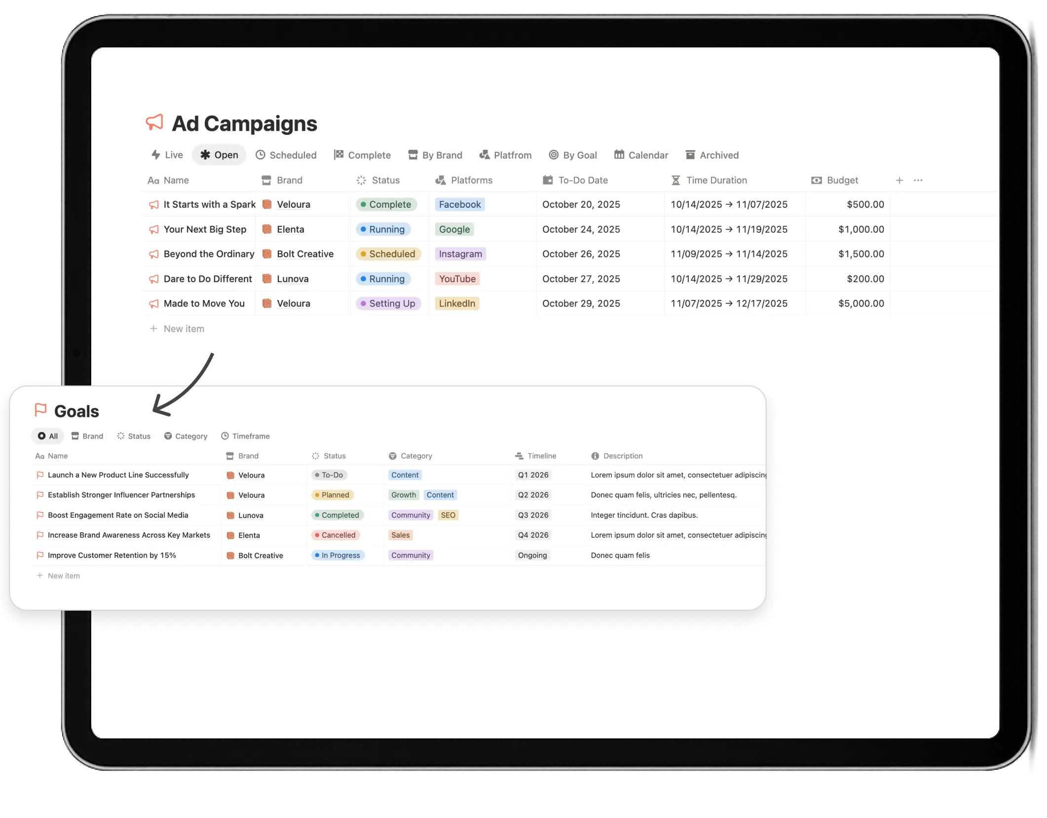 Track campaigns with clear objectives, budgets, timelines, and KPIs — so performance is always tied back to intent, not guesswork.