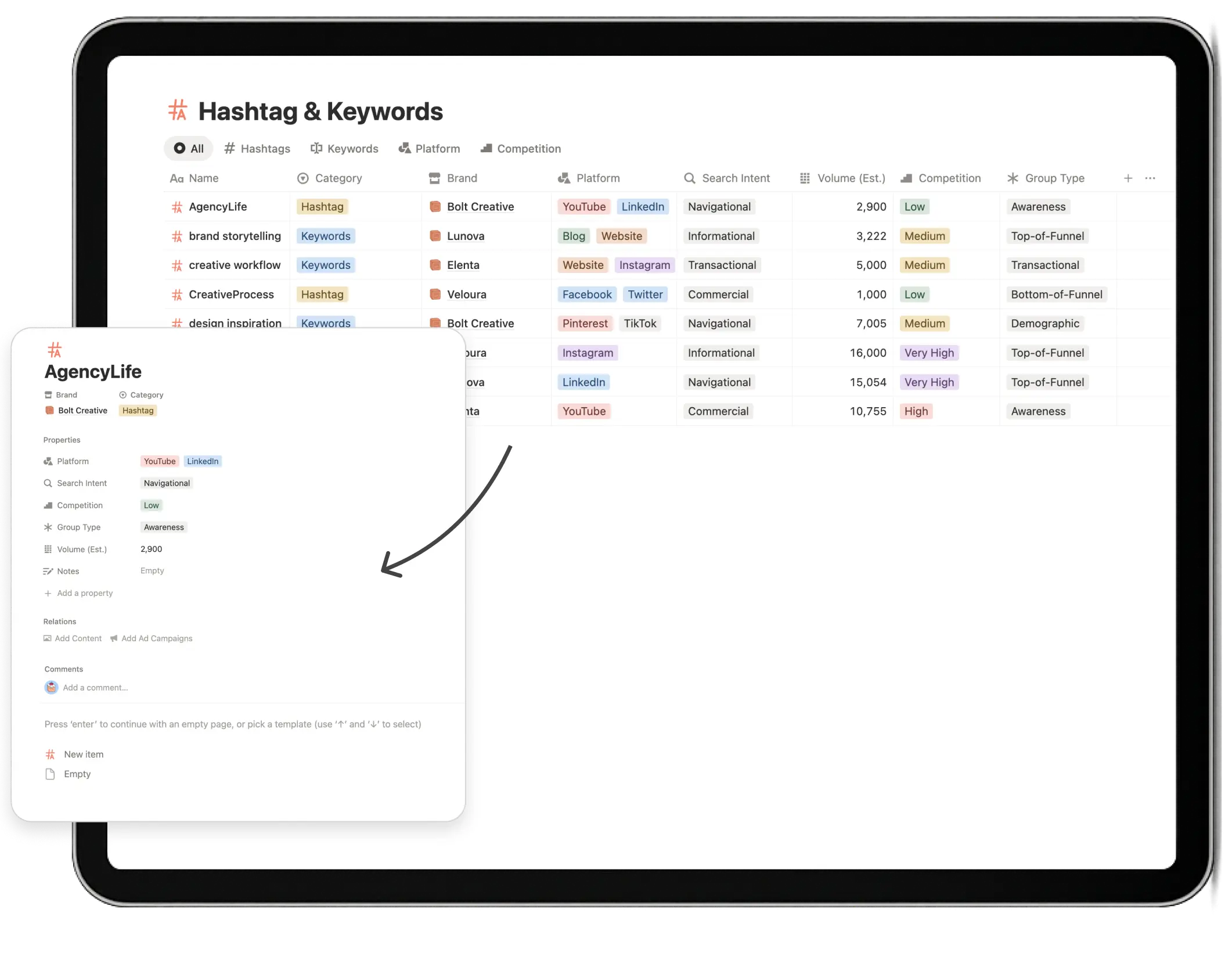 Reusable libraries for hashtags, keywords, hooks, and CTAs — linked directly to brands, content and campaigns to reduce repetition and speed up creation.